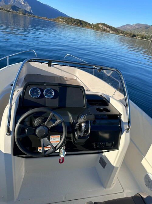 Poids, autonomie , Performances avec un 150cv, coffre de rangement du taud de soleil, Carène profonde et sécurité à bord grâce à la hauteur de franc bord
